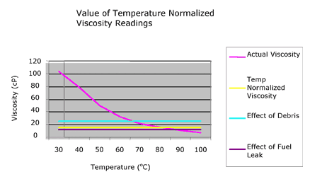 幸運(yùn)的是,油和許多其它液體溫度之間的關(guān)系表現(xiàn)出的特點(diǎn)和粘度。這些關(guān)系都是容易數(shù)學(xué)建模,允許溫度補(bǔ)償粘度粘度對任何點(diǎn)計(jì)算在選擇的參考溫度。附表1,例如,參考溫度設(shè)定在80°C。每個(gè)數(shù)據(jù)點(diǎn)粘溫然后重新計(jì)算數(shù)學(xué)假設(shè)參考溫度。在這個(gè)展覽,10 W30石油顯示了一個(gè)溫度補(bǔ)償?shù)恼扯?/span>TCV)80年的18°C cP的參考溫度在整個(gè)范圍的瞬時(shí)溫度和黏度測定值。閱讀超過黃線表示一個(gè)thicker-than TCV 10 W30理想灌裝,可能引起一種類型的碎片或另一個(gè)。然而,紫色TCV線表示低于目標(biāo)的粘度這可能造成燃料或冷卻劑泄漏。調(diào)整粘溫值允許在原油粘度TCV趨勢被發(fā)現(xiàn)很容易。